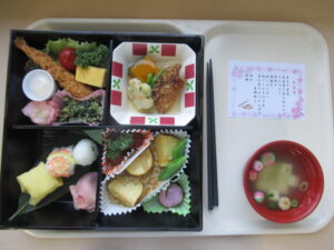 行事食はてまり寿司、桜しゅうまい、菜の花のほうれん草の菜種和え、桜餅など春らしい献立で